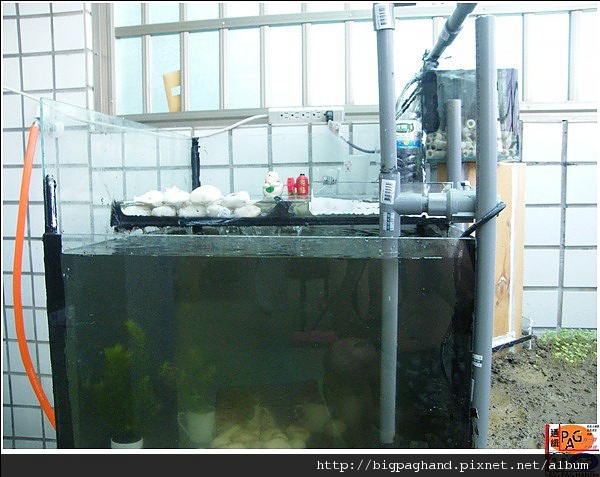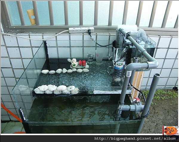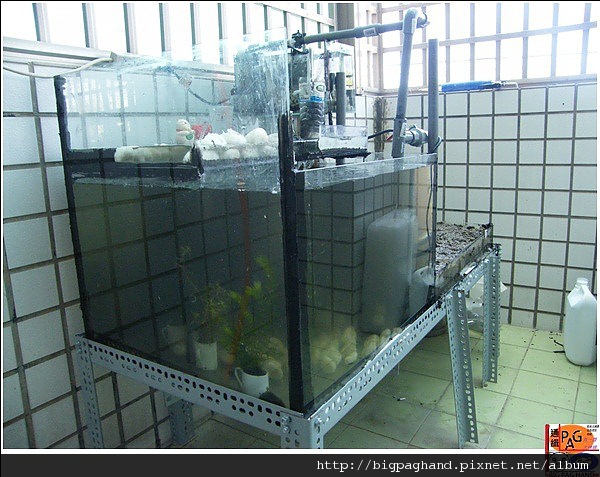 本缸的魚缸.採用獨立過濾系統缸.只靠一個沉水馬達來當抽水形成一個巡環.可惜的是手上沒有大一點的缸.只有一尺缸來當過濾系統缸(夠用嗎.其實還真的不夠用XD)