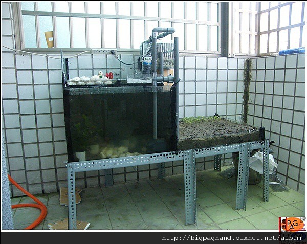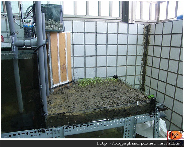本缸主體.有四尺的長度.拿舊四尺缸一面側缸來當底座.而右邊則是用來土種蔬菜用.目前已種植小白菜